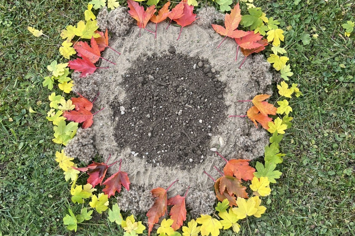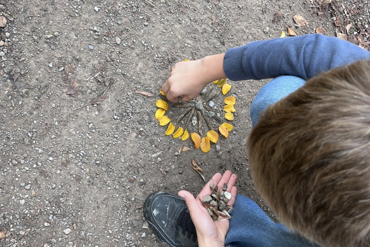 Zunächst sammelten die Schülerinnen und Schüler eine Farbpalette aus natürlichen Herbsttönen – Blätter, Steine, Rindenstücke und vieles mehr.